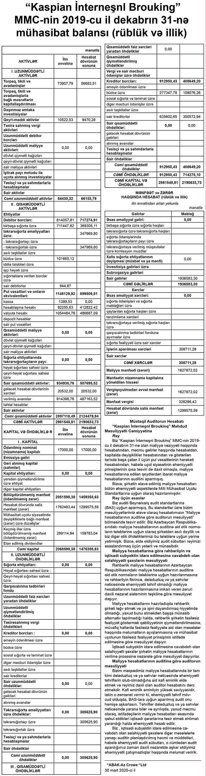 Müqayisə üçün qeyd edək ki, 2018-ci ildə “Kaspian İnterneşnl Brouking”in cəmi gəlirləri 2 milyon 561 min 904 manat, cəmi xərcləri 326 min 467 manat təşkil etmiş, Şirkət 2 milyon 235 min 437 manat maliyyə mənfəətindən 472 min 953 manat mənfəət vergisi ödəmişdi.