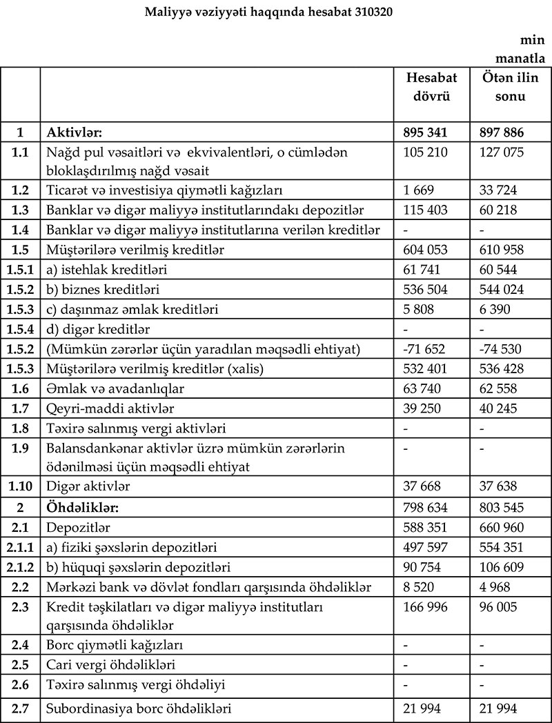 İlk 3 ayda Bankın depozit portfeli 72 milyon 609 min manat və ya 11% azalaraq 588 milyon 351 min manata düşüb.