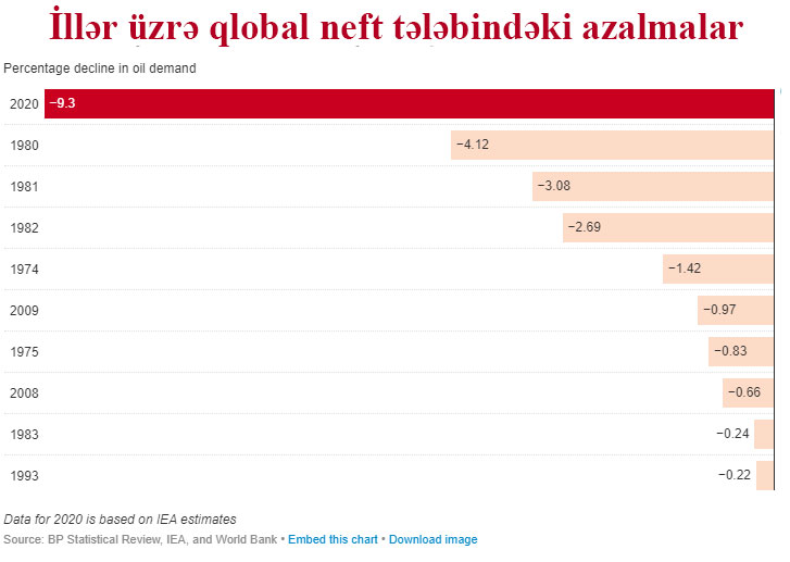 Dünya Bankına görə, səyahətlər məhdudlaşdırıldığına və azalacağına görə, 2020-ci ildə gündəlik 100 milyon barel olan neft tələbinin bu il gündəlik 9.3 milyon barrel düşəcəyi gözlənilir.
