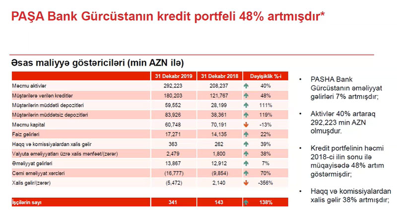 Taleh Kazımov əlavə edib ki, yeni layihə "PAŞA Bank Gürcüstan"ın xərclərini artırıb. Xərclərin artması ilə əlaqədar olaraq "PAŞA Bank Gürcüstan" ötən ili 5 milyon 472 min manat xalis zərər ilə bağlayıb.