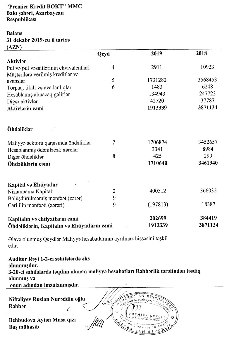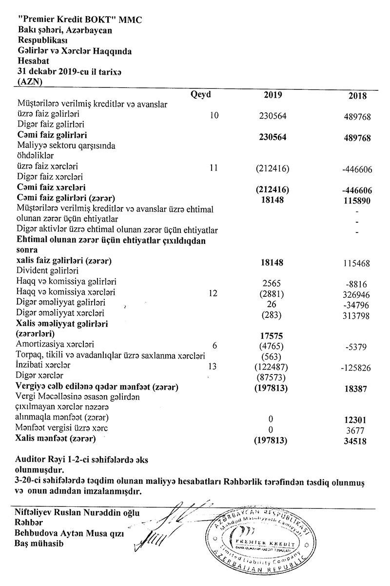 “Premier Kredit” MMC bank olmayan kredit təşkilatı (BOKT) 2019-cu ili 198 min manat zərərlə başa vurub. Halbuki, BOKT 2018-ci ildən 35 min manat xalis mənfəətlə çıxmışdı.