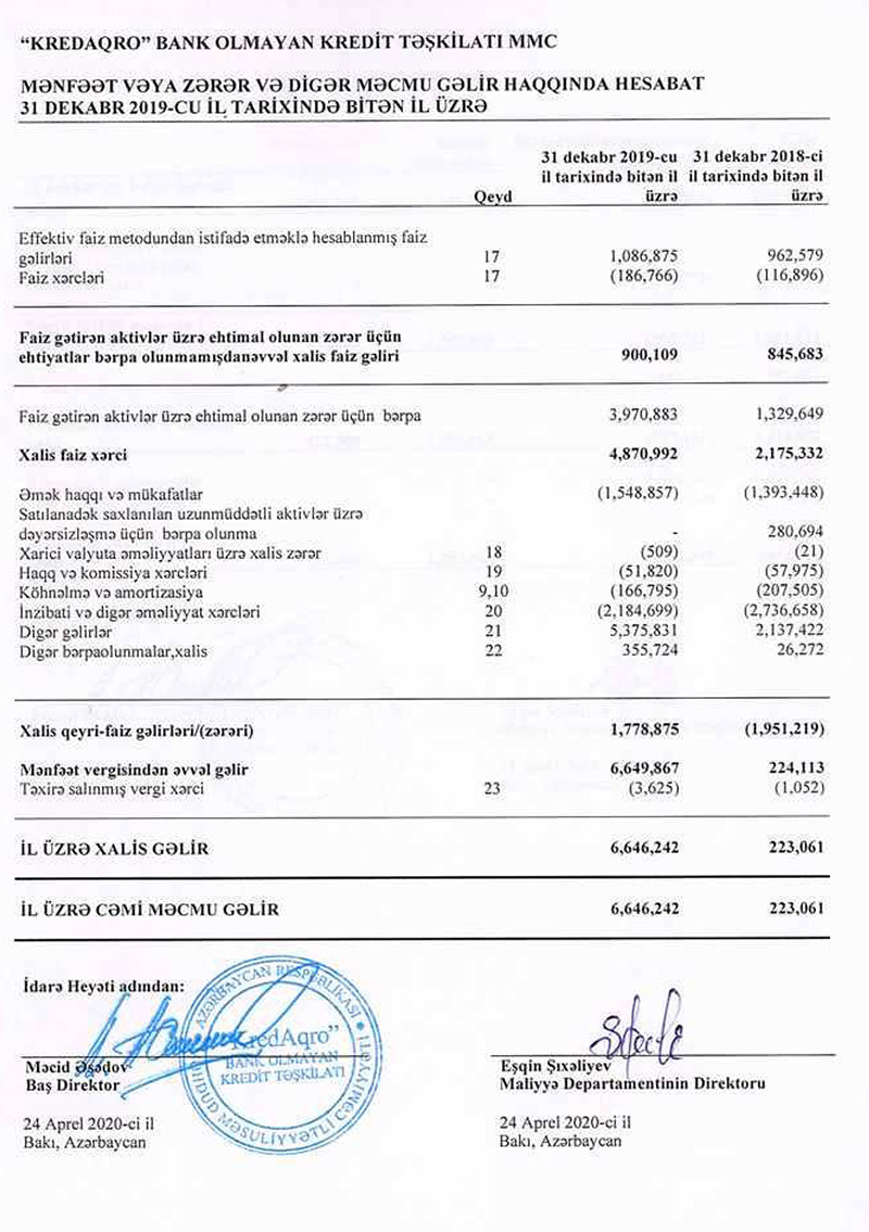 Ötən il “Kredaqro”nun vergiyəqədərki mənfəəti 6 milyon 650 min manat (əvvəlki ilə nisbətən 29,7 dəfə çox), mənfəət vergisi ödəmələri isə 4 min manat (4 dəfə çox) təşkil edib.