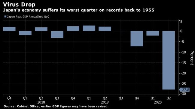 Pandemiyaya qədər Yaponiya iqtisadiyyatının ən pis rüblük məlumatı qlobal maliyyə böhranı əsnasında 1955-ci ildə qeydə alınmış və ümumi daxili məhsul 18% azalmışdı. Hazırda isə ardıcıl üç rüb qeyd alınan azalma ilə iqtisadiyyat 2011-ci ildə tsunami və nüklər fəlakətdən sonrakı səviyyəsinə geriləyəcək.