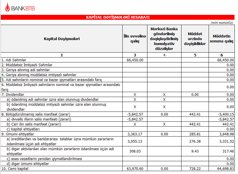 Qeyd edək ki, 2019-cu ilin yanvar-sentyabr dövründə Bank BTB-nin cəmi gəlirləri 20 milyon 633 min manat, cəmi xərcləri isə 19 milyon 295 min manat, əməliyyat mənfəəti isə 1 milyon 338 min manat təşkil etmişdi. Eyni zamanda, ehtiyatdan 2 milyon 663 min manatın azad olması hesabına mənfəət 3 milyon 999 min manata yüksəlmişdi.