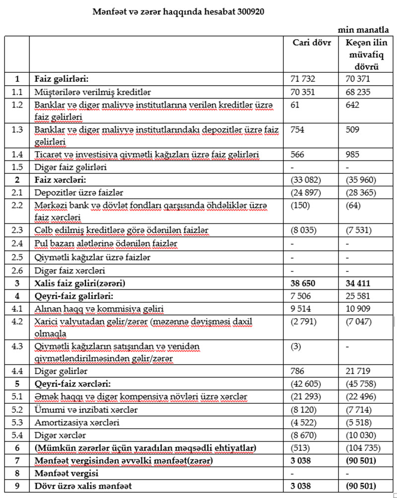 2020-ci ilin 9 ayında Bankın müştərilər verdiyi cəmi kreditlər 77 milyon 224 min manat azalaraq 30 Sentyabr 2020-ci il tarixində 533 milyon 734 min manat təşkil edib. Ötən ilin sonunda Bankda müştərilərə verilən cəmi kreditlər 610 milyon 958 min manat idi.