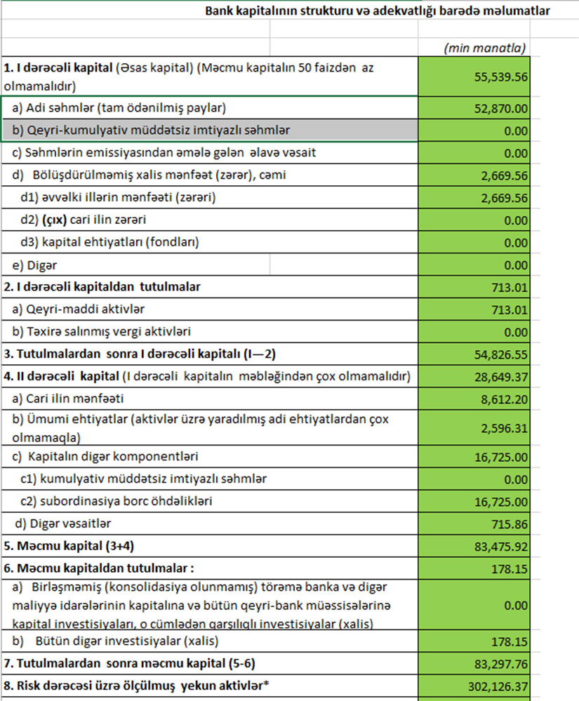 2020-ci ilin 9 ayı ərzində Bank of Bakunun məcmu kapitalı 29 milyon 74 min manat artıb. Belə ki, 30 Sentyabr 2020-ci il tarixində Bank of Baku 83 milyon 298 min manat məcmu kapitala malik olub. Bank ötən ilin sonunda 54 milyon 224 min manat məcmu kapitala malik idi.
