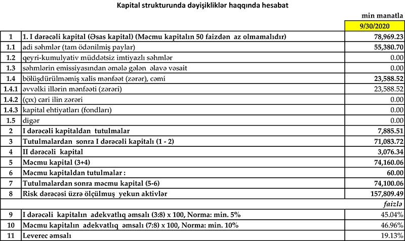 Bankın kapital göstəriciləri kifayət qədər qənaətbəxşdir. Belə ki, ötən ilin müvafiq dövrü ilə müqayisədə bankın tutulmalardan sonra I dərəcəli kapitalı artaraq 71.1 mln AZN, məcmu kapitalı isə artaraq 74,1 milyon AZN olmuşdur.