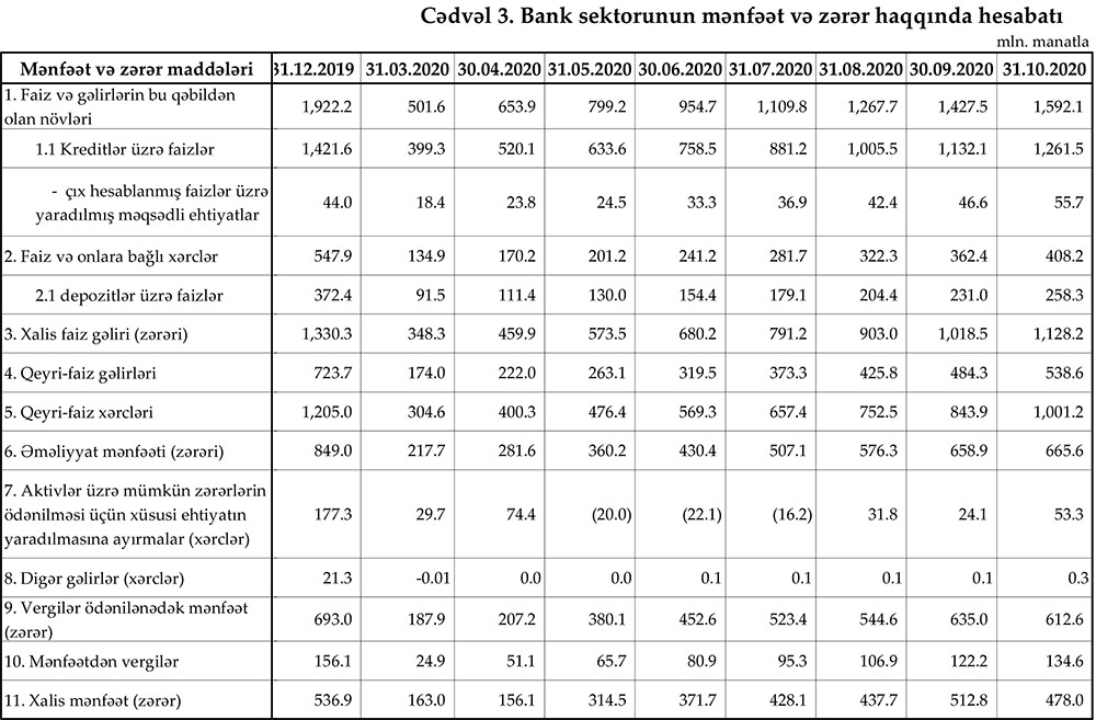 Ötən ilin 10 ayında bank sektorunun faiz gəlirləri 1 milyard 592 milyon 300 min manat ikən, 2020-ci ilin eyni dövründə 1 milyard 592 milyon 100 min manat təşkil edib. Qeyri-faiz gəlirləri isə 576 milyon manatdan 538.6 milyon manata geriləyib.