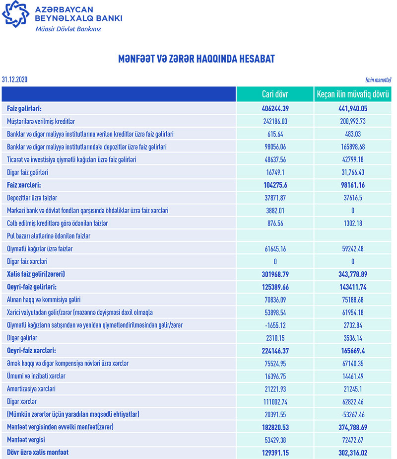 Marja Bankın maliyyə hesabatlarına istinadən xəbər verir ki, Azərbaycan Beynəlxalq Bankı 2020-ci ili 129 milyon 391 min manat xalis mənfəətlə başa vurub. Bankın ümumi mənfəəti 182 milyon 821 min manat olub. Bank əldə etdiyi mənfəətdən 53 milyon manat vergi ödəyib. Yada salaq ki, Azərbaycan Beynəlxalq Bankı 2019-cu ili 302 milyon 316 min manat xalis mənfəətlə bağlamışdı.