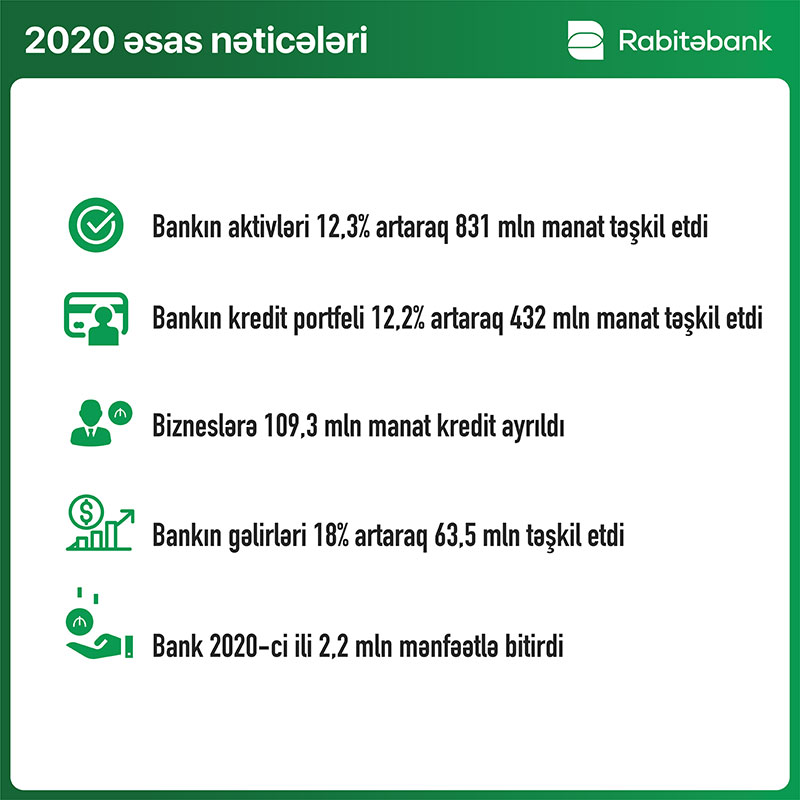 "Rabitəbank” 2020-ci ildə 12% böyüyüb“Rabitəbank” ASC 2020-ci ilin yekunlarına dair maliyyə hesabatını açıqlayıb.