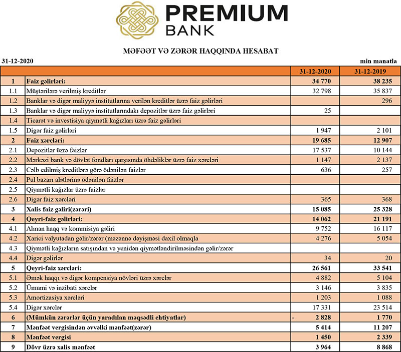 “Premium Bank” ASC 2020-ci ili 3 miylon 964 min manat xalis mənfəət ilə başa vurub. 2019-cu illə müqayisədə 2020-ci ildə Bankın xalis mənfəəti 2,2 dəfə azalıb. “Premium Bank” 2019-cu ili 8 milyon 868 min manat xalis mənfəət ilə bağlamışdı.