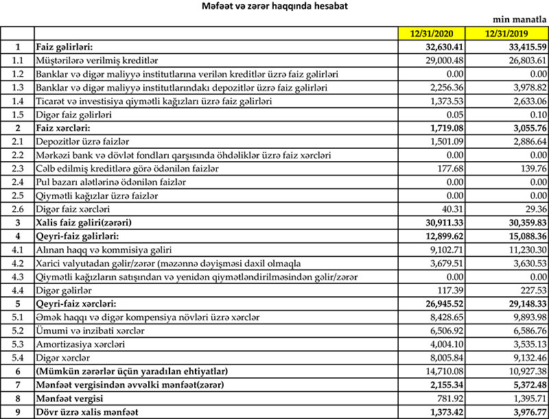 “Yapı Kredi Bank Azərbaycan” 2020-ci ili 1 milyon 373 min manat xalis mənfəət ilə başa vurub. Bank 2019-cu ili 3 milyon 977 min manat xalis mənfəətlə bağlamışdı. Xalis mənfəətin azalmasının əsas səbəbi “Yapı Kredi Bank Azərbaycan”ın mümkün zərərlər üçün yaradılan ehtiyatlara ayırmanı artırması ilə əlaqədardır.