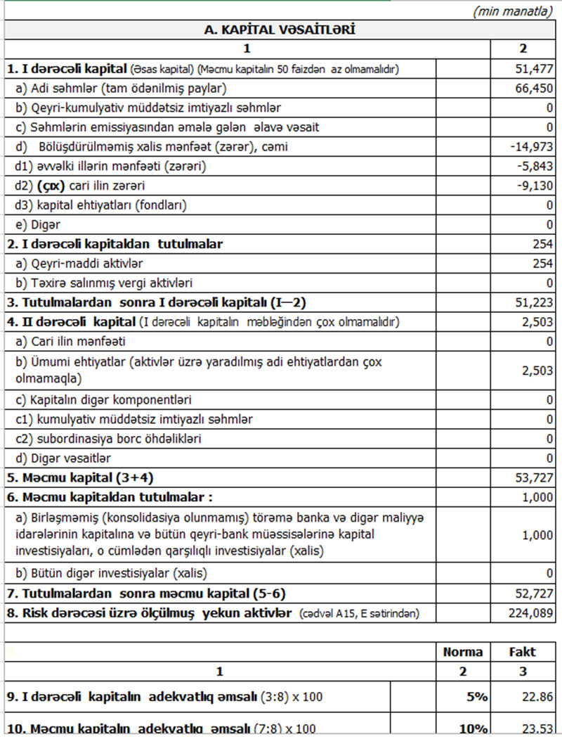 2020-ci ilin sonunda Bank BTB52 milyon 727 min manat məcmu kapitala malik olub. Bank 2019-cu ilin sonunda 62 milyon 99 min manat məcmu kapitala malik idi. Məcmu kapitalın azalması - gələcəkdə yarana biləcək potensial risklərin qarşılanması məqsədi ilə bank tərəfindən mühafizəkar yanaşma tətbiq edilərək ehtiyat yaradılması ilə əlaqədardır.