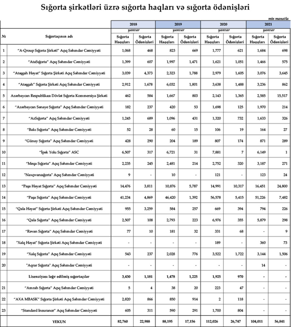 2021-ci ilin Yanvar ayı ərzində Azərbaycanın sığorta şirkətləri tərəfindən 104 milyon 11 min manat sığorta haqları toplanıb, 56 milyon 841 min manat sığorta ödənişləri həyata keçirilib.