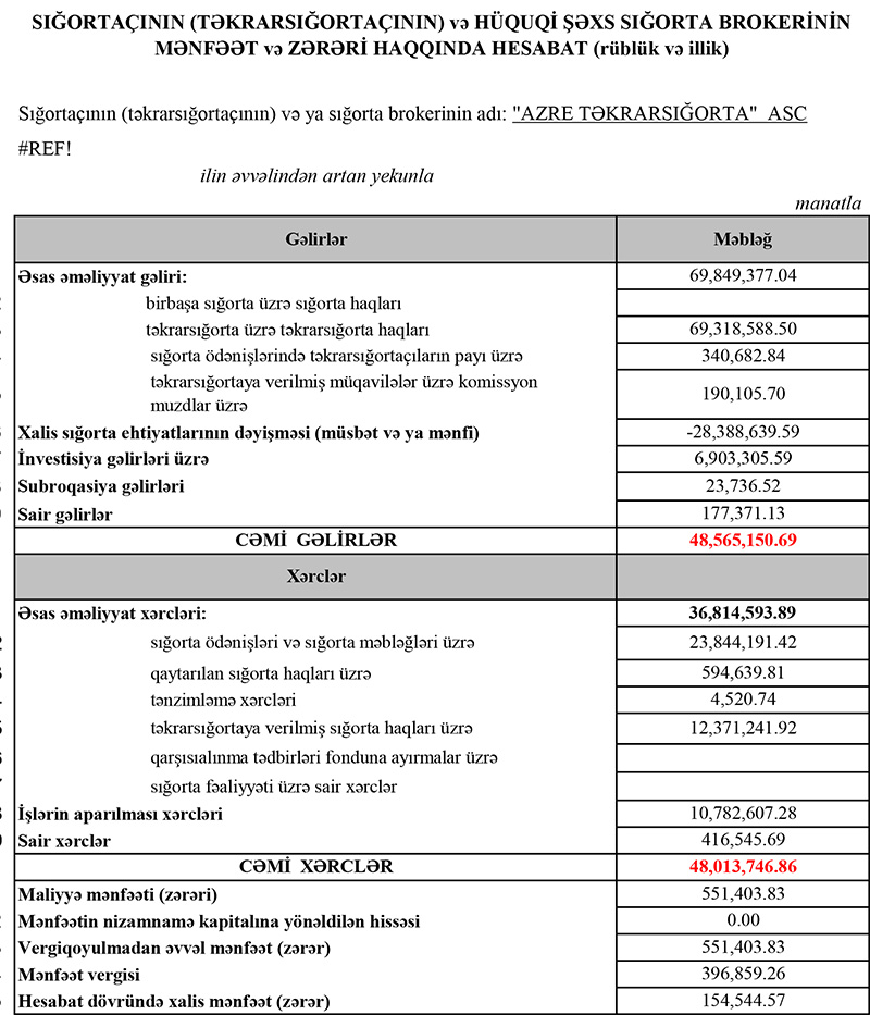 Azərbaycanın ilk və yeganə təkrarsığorta şirkəti olan “AzRe Təkrarsığorta” ASC 2020-ci ili 154 min 544 manat xalis mənfəət ilə başa vurub. Halbuki, şirkət 2019-cu ili 25 milyon 586 min 398 manat xalis mənfəət ilə bağlamışdı. Beləliklə, “Azre”nin xalis mənfəəti 165 dəfədən çox azalıb. “AzRe Təkrarsığorta” ASC 2018-ci ili 25 milyon 64 min manat xalis mənfəət ilə başa vurmuşdu.