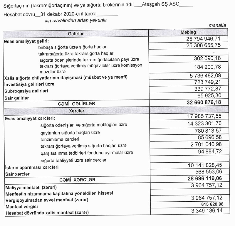“Atəşgah” Sığorta Şirkəti 2020-ci ili 3 milyon 349 min manat xalis mənfəət ilə başa vurub. Halbuki, Şirkət 2019-cu ili 1 milyon 178 min manat xalis mənfəət ilə bağlamışdı. Beləliklə, illik müqayisədə “Atəşgah” Sığorta Şirkətinin xalis mənfəəti 2,8 dəfə artıb. Artımın səbəbi Şirkətin yığımlarının artırılması deyil, xərclərinin gəlirlərindən daha çox azaldımasıdır.
