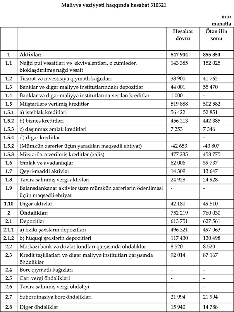 Habelə, 2021-ci ilin birinci rübü ərzində bankın xalis faiz gəlirləri 12.2 milyon manata bərabər olub.