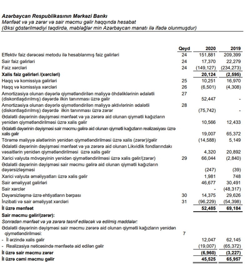 Azərbaycan Mərkəzi Bankı (AMB) 2020-ci ili 52 milyon 485 min manat xalis mənfəətlə başa vurub.