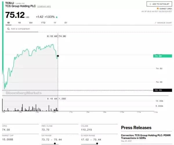 Marja xəbər verir ki, Bloomberg-dəki məlumatlara görə, London Fond Birjasında "TCS Group"un (Tinkoff Bank və Tinkoff Sığortanı birləşdirir) hər səhminin qiyməti 75,12 dollara çatıb.