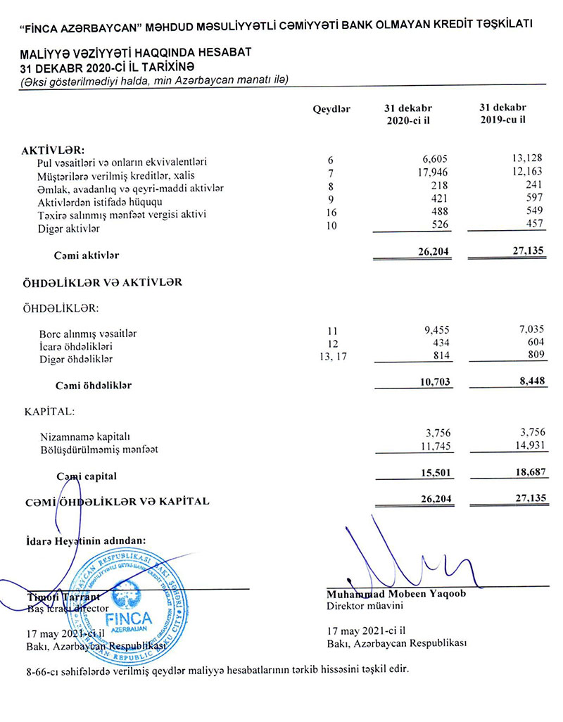 Hesabatdan məlum olur ki, “FİNCA Azərbaycan”ın cari fəaliyyətində tənəzzül mövcud deyil, xalis mənfəətin azalması ehtiyatdan azad olan vəsaitin azalması ilə əlaqədardır. Təşkilat əvvəlki dövrlərdə ehtimal olunan kredit zərərlərinin bərpası üçün ehtiyat yaratmışdır. Verilmiş kreditlər üzrə gözlənilən qədər zərər olmadığından 2019-cu ildə ehtiyatın bir hissəsi gəlirə əlavə edilmişdi. Bu səbəbdən “FİNCA Azərbaycan”ın xalis mənfəəti yüksək olmuşdu.