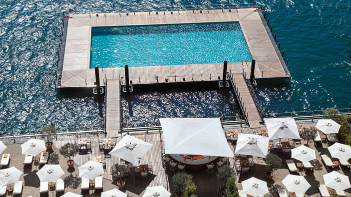 Birbaşa Komo gölünün sahilində yerləşən hotelin 90 lüks nömrəsi və üç hovuzu var. Hovuzlardan biri gölün düz içərisində düzəldilib.