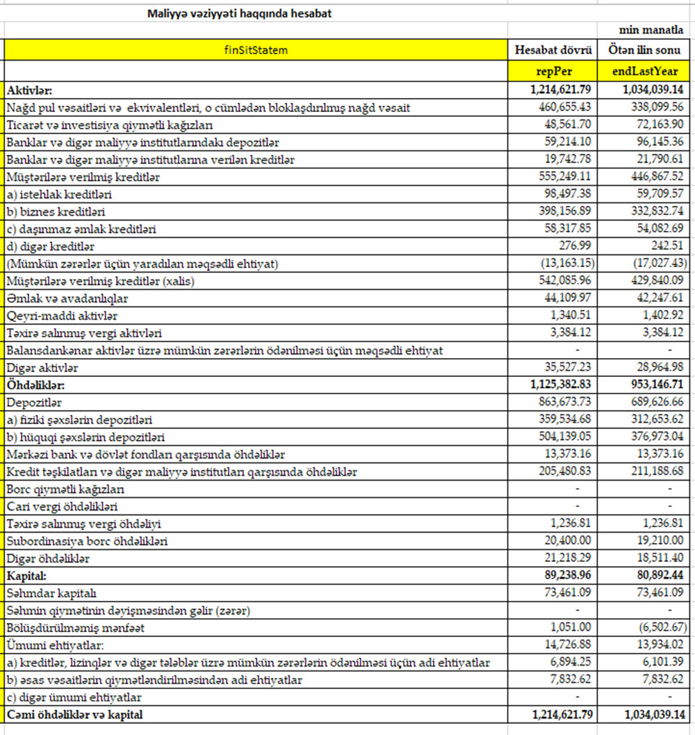 Azərbaycandakı 5-ci böyük bank maliyyə vəziyyətini açıqladı