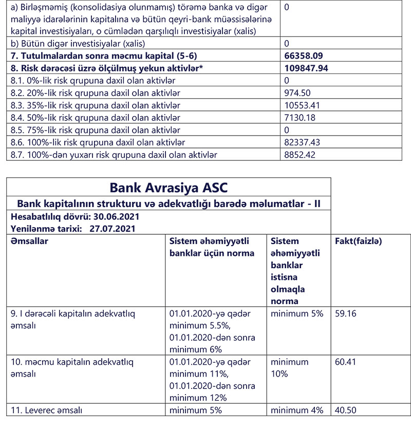 30 İyun 2021-ci il tarixində "Bank Avrasiya" 66 milyon 358 min manat məcmu kapitala malik olub. Bank ötən ilin sonunda 70 milyon 225 min manat məcmu kapitala malik idi.