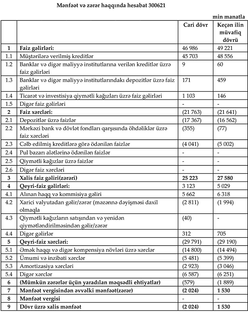 2021-ci ilin birinci yarısında Bankın xalis faiz gəlirləri 25.2 milyon manata bərabər olub. Bu da ötən yarım illə müqayisədə 2.4 milyon manat azalıb.