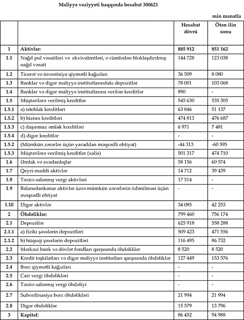 İyun ayının sonuna Bankın əmanət portfeli 626 milyon manat təşkil edib. Bu isə 2020-ci ilin sonu ilə müqayisədə 1.6 milyon manat azdır.