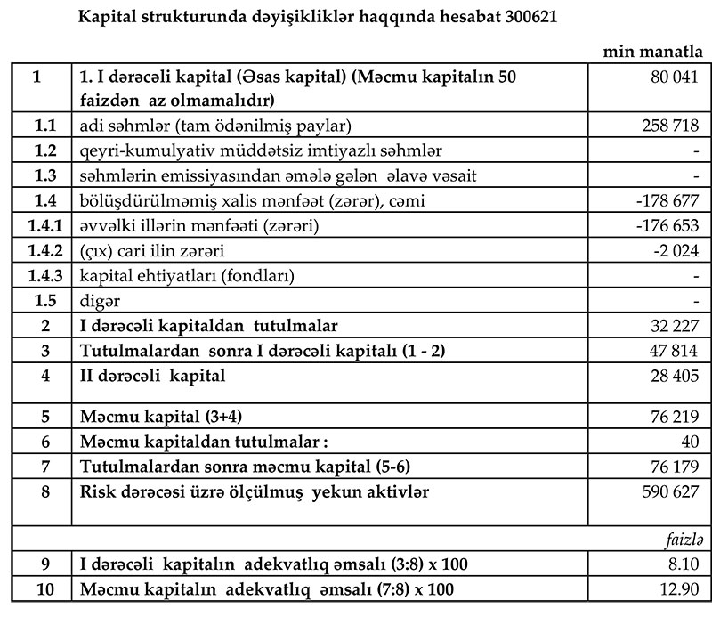 Hazırda Bankın cəmi balans kapitalı 76.2 milyon manat təşkil edir ki, bu da minimum məcmu kapital normasından (50 milyon manat) 26.2 manat artıqdır.