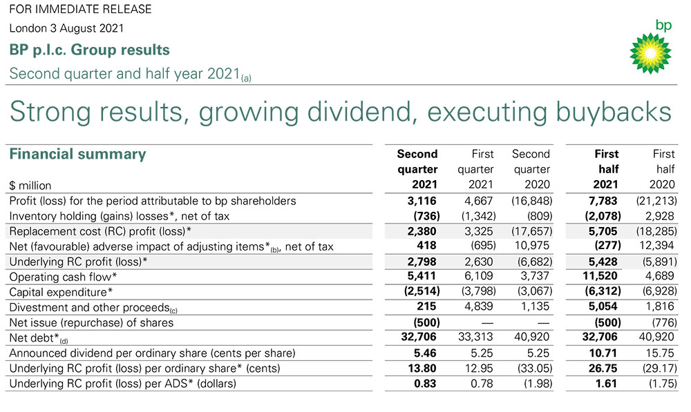 Ötən il koronavirus pandemiyasına görə neft qiymətlərinin düşməsindən ciddi ziyan çəkən BP bu il mənfəətə çıxa bilib. Belə ki, 2020-ci ilin ikinci rübündə zərər 17,52 milyard dollar, ilk 6 ayda isə 26,13 milyard dollar idisə, şirkət bu ilin ikinci rübündə 3,35 milyard dollar, ilin ilk yarısında cəmi 8,25 milyard dollar mənfəət əldə edib.
