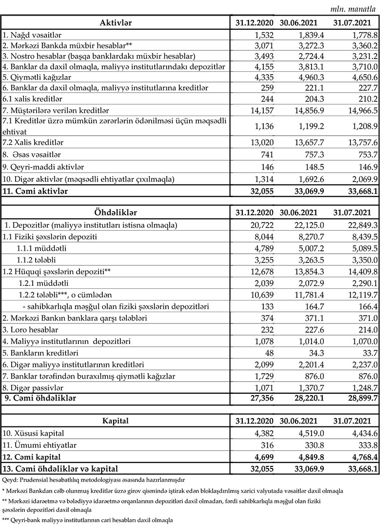 2021-ci ilin iyul ayında fiziki şəxslərin banklardakı depozitləri 168,8 milyon manat artaraq 8 milyard 439.5 milyon manata çatıb. İyunun sonunda fiziki şəxslərin banklardakı depozitləri 8 milyard 270,7 milyon manat təşkil etmişdi.