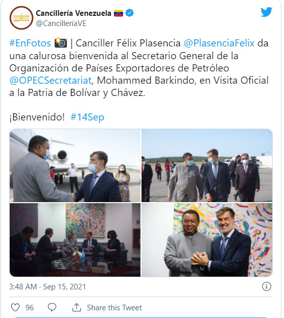 Venesuelanın Xarici İşlər Nazirliyindən verilən məlumata görə, Neft İxrac Edən Ölkələr Təşkilatının (OPEC) baş katibi Məhəmməd Barkindo Venesuelaya səfərə gəlib.