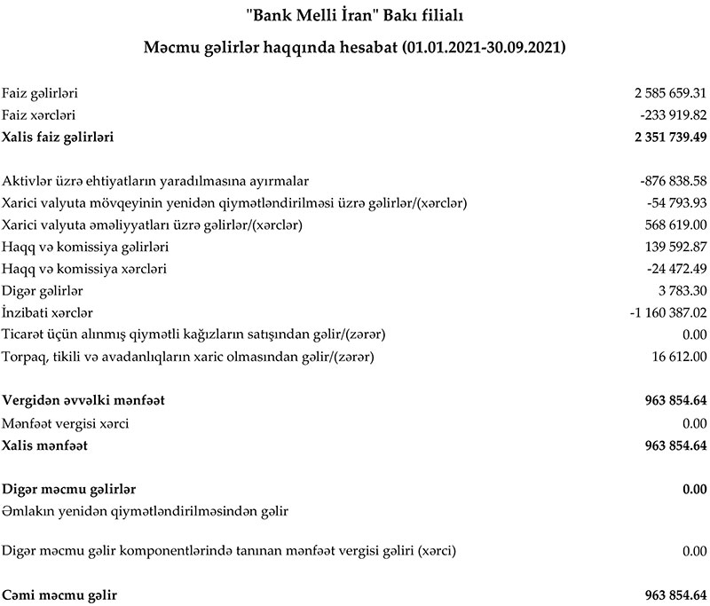 2021-ci ilin 9 ayında "Bank Melli İran" Bakı filialının faiz gəlirləri 2 milyon 585 min 659 manat (+33,2%), haqq və komissiya gəlirləri 139 min 593 manat (+31,6%), xarici valyuta əməliyyatları üzrə gəlirlər 568 min 619 manat (+67,8%) təşkil edib. Ötən ilin eyni dövründə filialın faiz gəlirləri 1 milyon 940 min 314 manat, haqq və komissiya gəlirləri 105 min 998 manat, xarici valyuta əməliyyatları üzrə gəlirlər 338 min 804 manat təşkil etmişdi.