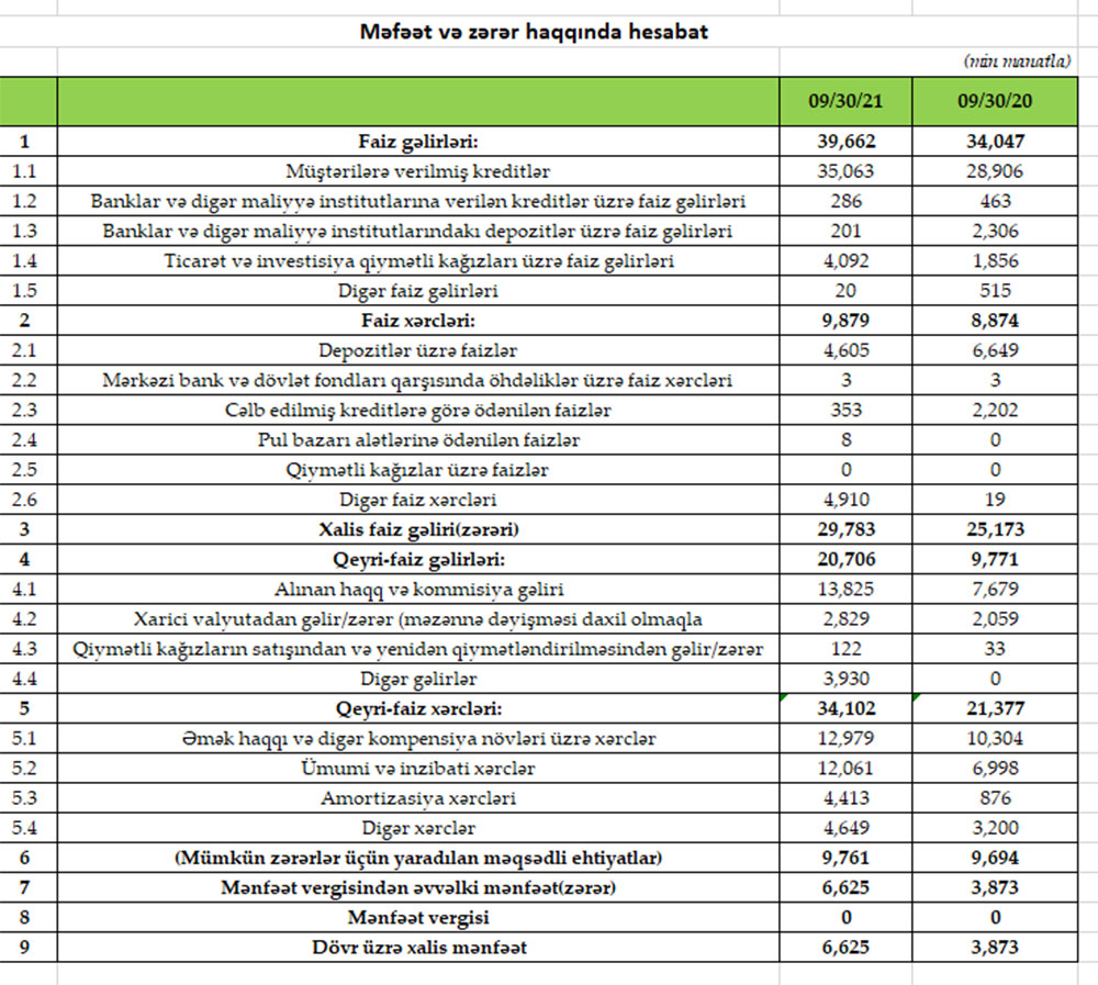 Müqayisə üçün qeyd edək ki, 2020-ci ilin yanvar-sentyabr dövründə “Rabitə Bank”ın cəmi əməliyyat gəlirləri 43 milyon 818 min manat, cəmi əməliyyat xərcləri 30 milyon 251 min manat, əməliyyat mənfəəti 13 milyon 567 min manat təşkil etmişdi. Əməliyyat mənfəətinin 9 milyon 694 min manatı ehtiyata ayırdığı üçün Bank həmin dövrü 3 milyon 873 min manat xalis mənfəət ilə bağlamışdı.