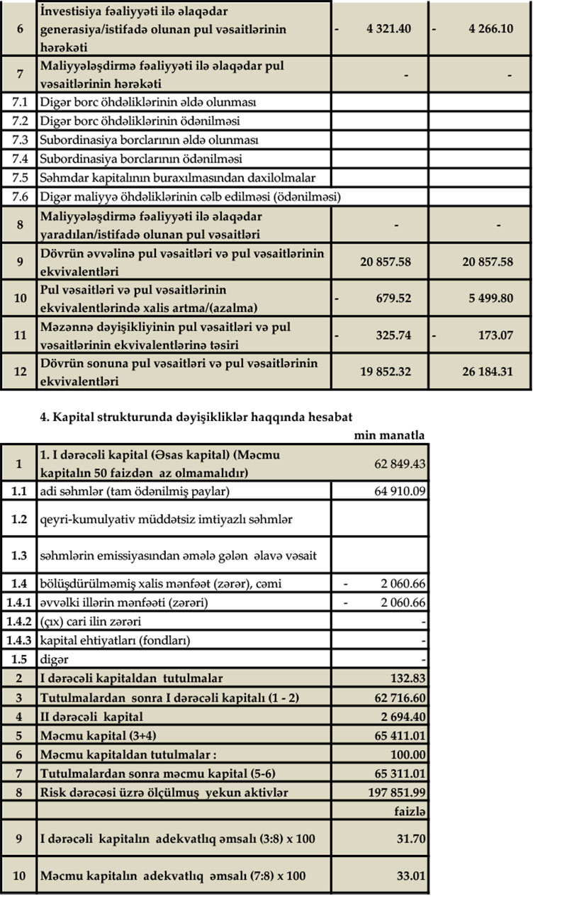 Bankın məcmu kapitalı isə ilin əvvəlinə nisbətən 463.9 min manat artaraq, 65 milyon 311.01 min manata çatıb.