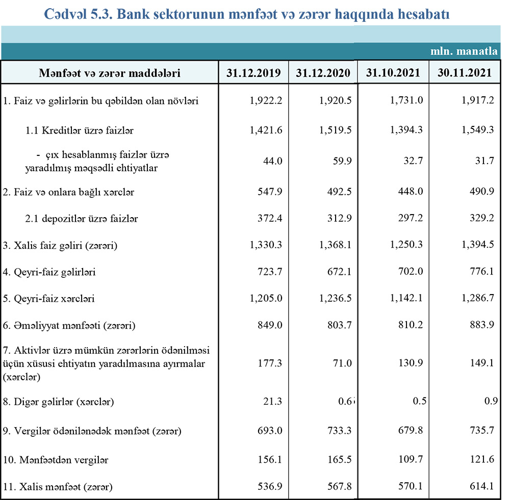 2020-ci ilin 11 ayı ilə müqayisədə 2021-ci ilin 11 ayında bank sektorunun xalis mənfəəti 66 milyon manat və ya 12% artıb. Bank sektoru 2020-ci ilin 11 ayını 548,1 milyon manat xalis mənfət ilə başa vurmuşdu.
