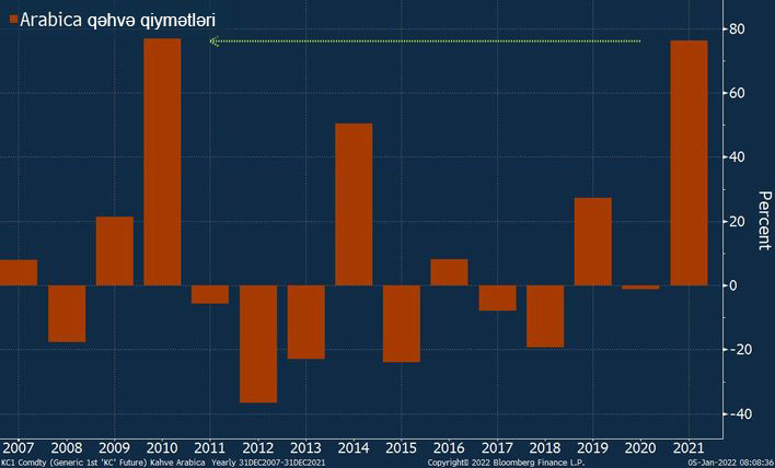 Qəhvə qiymətləri 2021-ci ildə 76,30 faiz artaraq ili 2010-cu ildən bəri ən böyük qiymət artımı ilə yekunlaşdırıb.