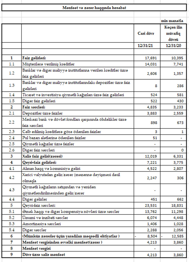 Ötən il ərzində fəaliyyətinin yekunları üzrə bankın xalis mənfəəti 4 milyon 213 min manat təşkil edib (artım 9,1%).