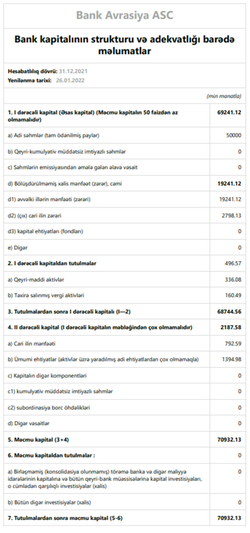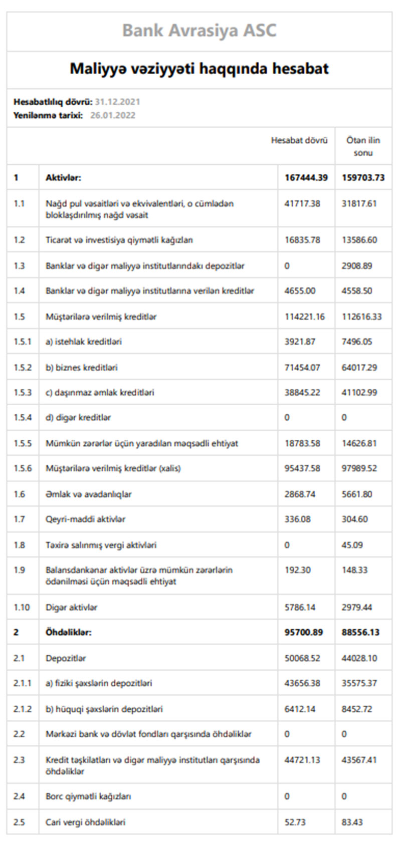 “Bank Avrasiya” ASC 2021-ci il üzrə maliyyə göstəricilərini açıqlayıb.
