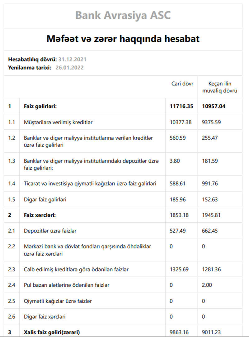 Marja.az xəbər verir ki, “Bank Avrasiya”2021-ci ili 793 min manat xalis mənfəət ilə başa vurub. Bank 2020-ci ili 1 milyon 226 min manat xalis mənfəət ilə bağlamışdı. Beləliklə, “Bank Avrasiya”nın xalis mənfəəti 2020-ci illə müqayisədə 2021-ci ildə 35,4% və ya 433,5 min manat azalıb. Xalis mənfəətin azalması mümkün zərərlər üçün yaradılan məqsədli ehtiyatlara ayırmanın artması ilə əlaqədardır. Ötən il, “Bank Avrasiya” nın gəlirləri və əməliyyat mənfəəti artıb.