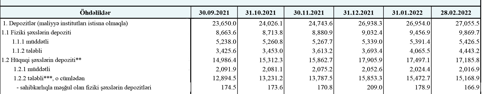 2022-ci ilin fevral ayında müddətli əmanətlər 35,1 milyon manat, tələbli əmanətlər isə 377,7 milyon manat artıb, sahibkarlıqla məşğul olan fiziki şəxslərin depozitləri isə 12 milyon manat azalıb.