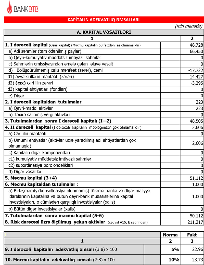 31 Mart 2022-ci il tarixində "Bank BTB" 50 milyon 112 min manat məcmu kapitala malik olub.