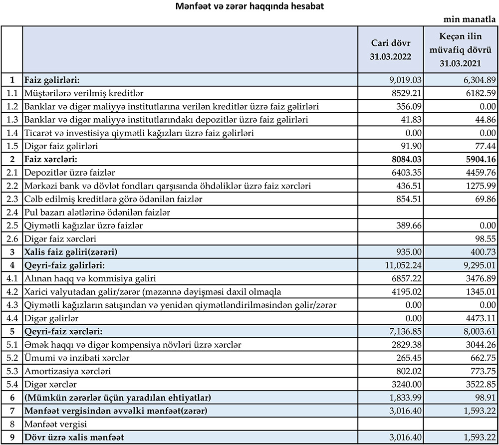 Müqayisə üçün qeyd edək ki, 2021-ci ilin yanvar-mart dövründə “Muğanbank”ın cəmi əməliyyat gəlirləri 15 milyon 600 min manat, cəmi əməliyyat xərcləri 13 milyon 907 min manat, əməliyyat mənfəəti 1 milyon 693 min manat təşkil etmişdi. Bank əməliyyat mənfəətindən 99 min manat ehtiyatlara ayrıdığından həmin dövrü 1 milyon 593 min manat xalis mənfəət ilə bağlamışdı.