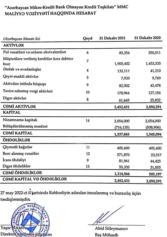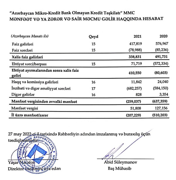 "Azərbaycan Mikro-Kredit Bank Olmayan Kredit Təşkilatı" MMC 2021-ci ili 207 min manat xalis zərər ilə başa vurub. Halbuki, təşkilat 2020-ci ili 510 min manat xalis zərər ilə bağlamışdı. Beləliklə, 2020-ci illə müqayisədə 2021-ci ildə "Azərbaycan Mikro-Kredit"in xalis zərəri 2,5 dəfə azalıb.