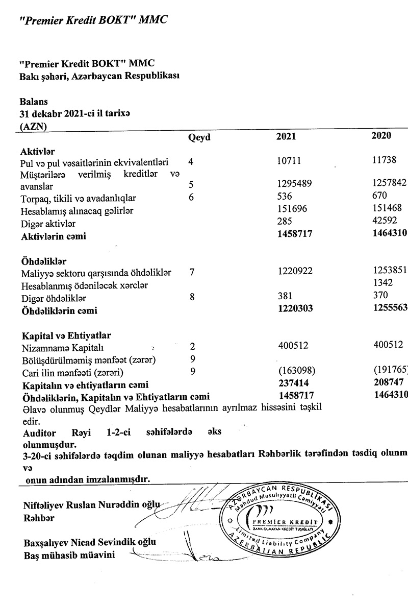 2020-ci illə müqayisədə 2021-ci ildə "Premier Kredit BOKT" kredit portfeli (müştərilərə verilmiş kreditlər) 38 min manat artaraq 1 milyon 295 min manata çatıb.