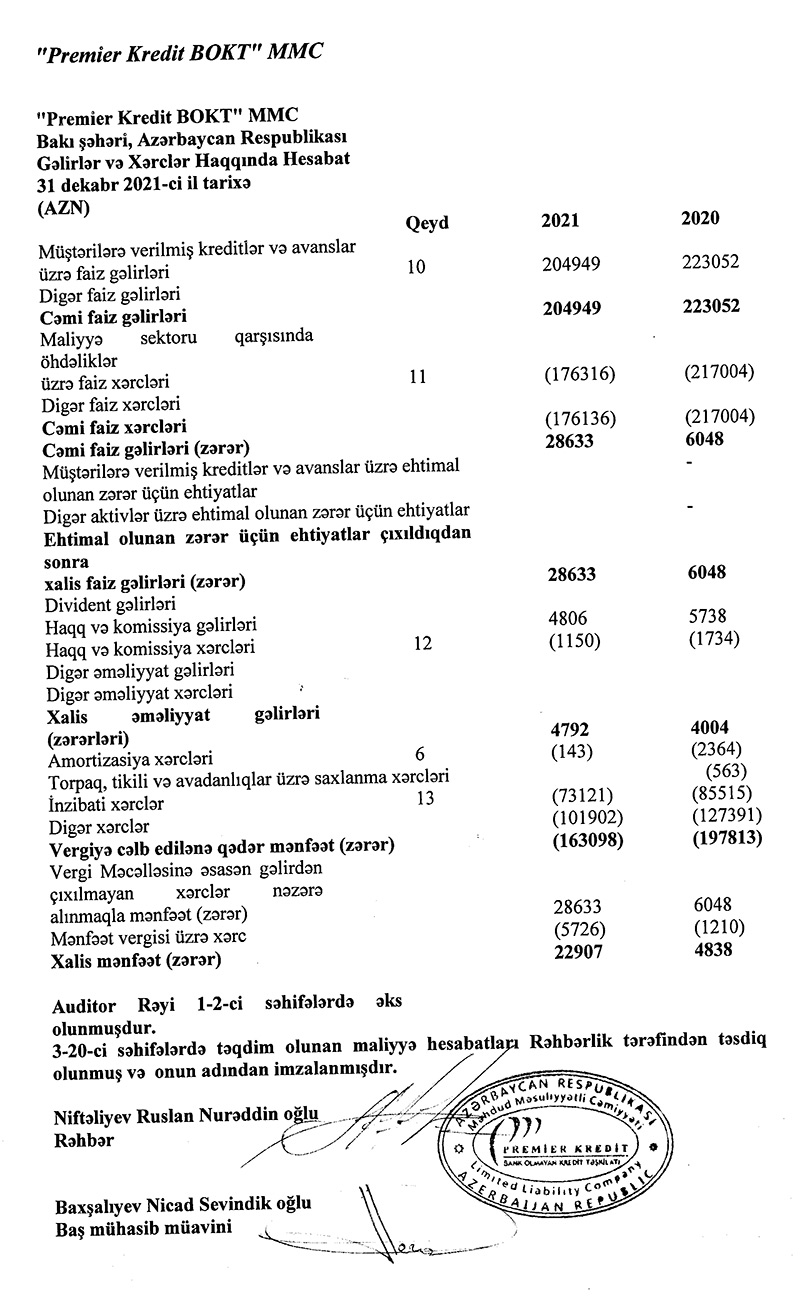 "Premier Kredit BOKT" MMC 2021-ci li 22 min 907 manat xalis mənfəət ilə başa vurub. Halbuki, təşkilat 2020-ci ili 4 min 838 manat xalis mənfəət ilə bağlamışdı. Beləliklə, 2020-ci illə müqayisədə 2021-ci ildə "Premier Kredit BOKT"un xalis mənfəəti 4,7 dəfə artıb.