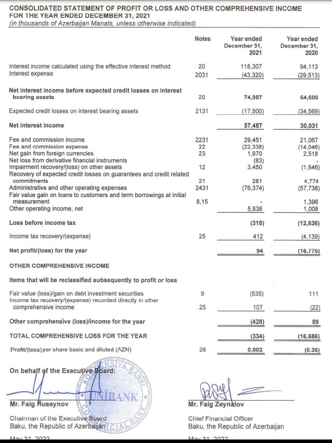 Marja.az hesabatlara istinadən xəbər verir ki, Unibank qrupu 2021-ci ili 94 min manat xalis mənfəət ilə başa vurub. Halbuki, qrup 2020-ci ili 16 milyon 775 min manat xalis zərər ilə bağlamışdı.