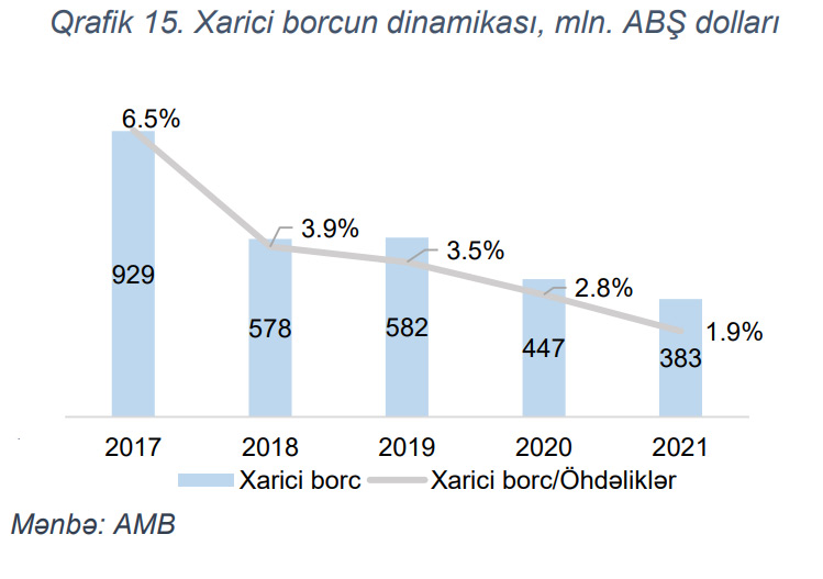 Qeyd edilib ki, 2017-2020-ci illər ərzində bankların xarici borcu 2 dəfədən çox, il ərzində isə 14.3% (63 mln. ABŞ dolları) azalaraq 383 mln. ABŞ dolları təşkil etmişdir .