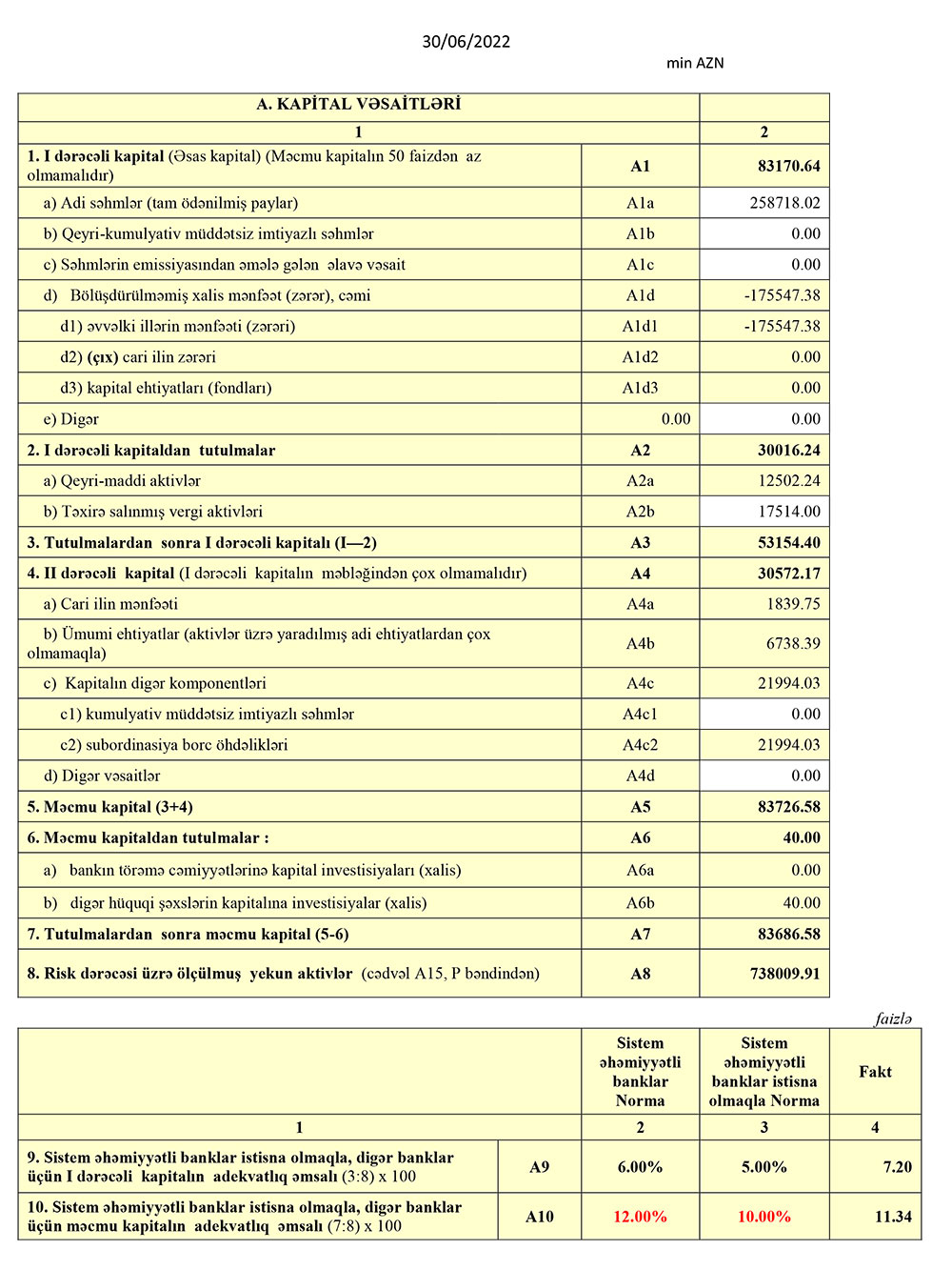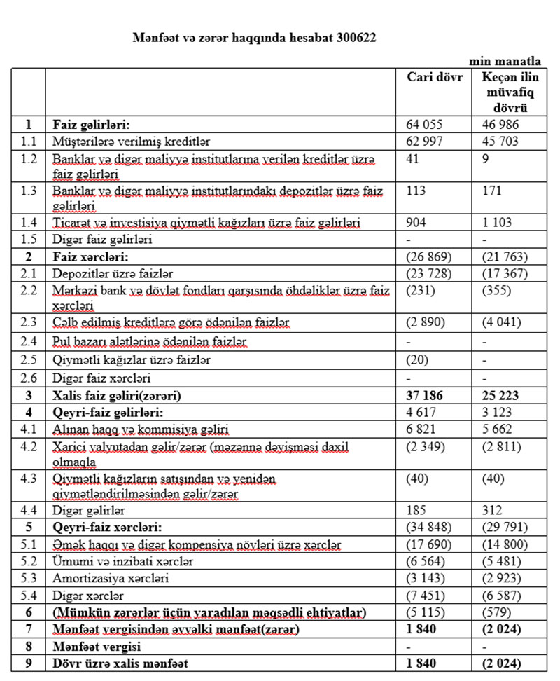 Müqayisə üçün qeyd edək ki, 2021-ci ilin yanvar-iyun dövründə “AccessBank”ın cəmi əməliyyat gəlirləri 50 milyon 109 min manat, cəmi əməliyyat xərcləri 51 milyon 554 min manat, xərclər gəlirləri üstələdiyindən əməliyyat zərəri 1 milyon 445 min manat təşkil etmişdi. Bank mümkün zərərlər üçün yaradılan məqsədli ehtiyatlara 579 min manat ayırdığından zərəri 2 milyon 24 min manata yüksəlmişdi.